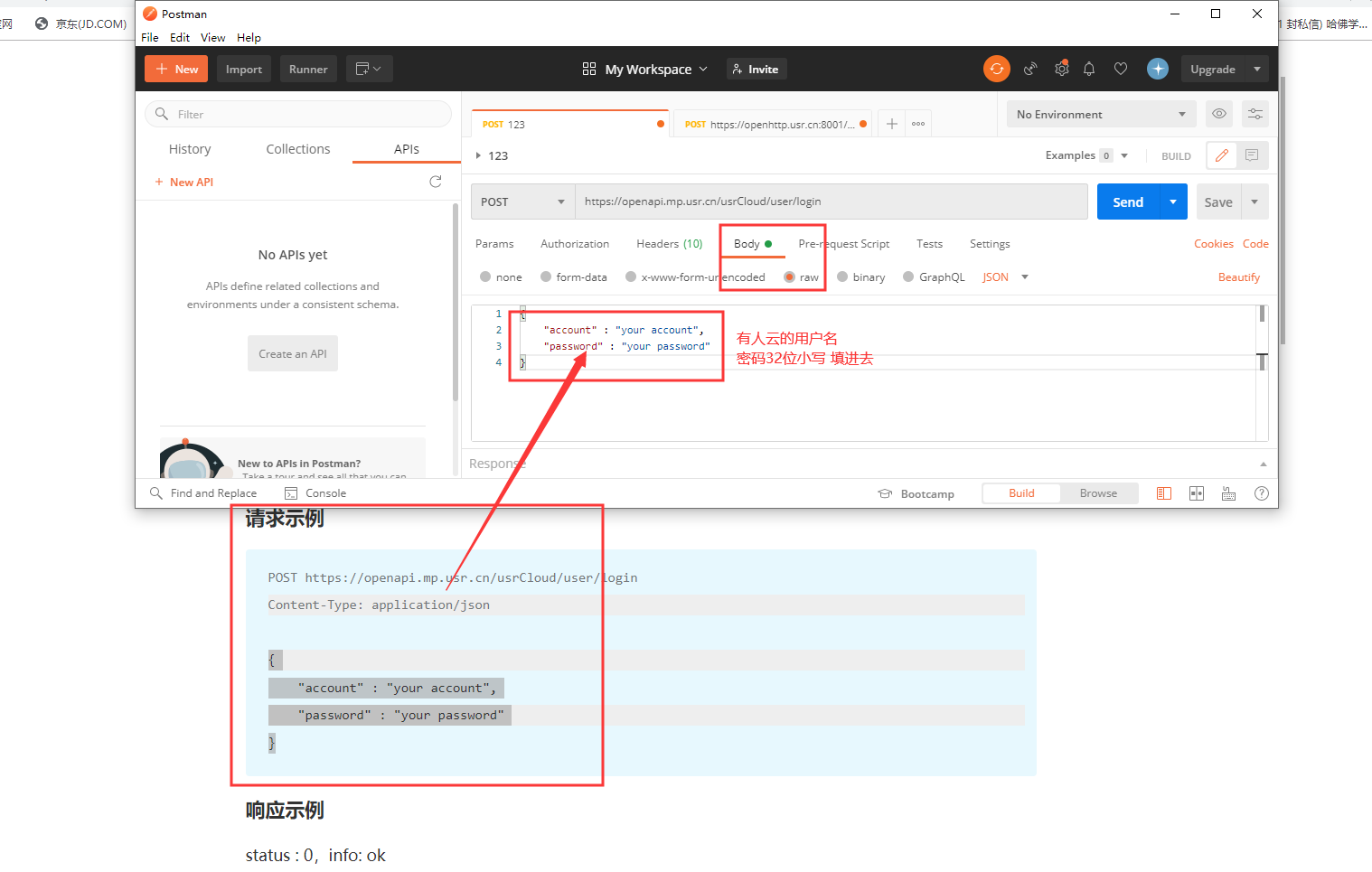 account中填有人云账号,password中填有人云密码md5加密之后的密码