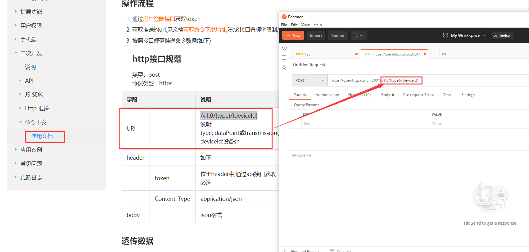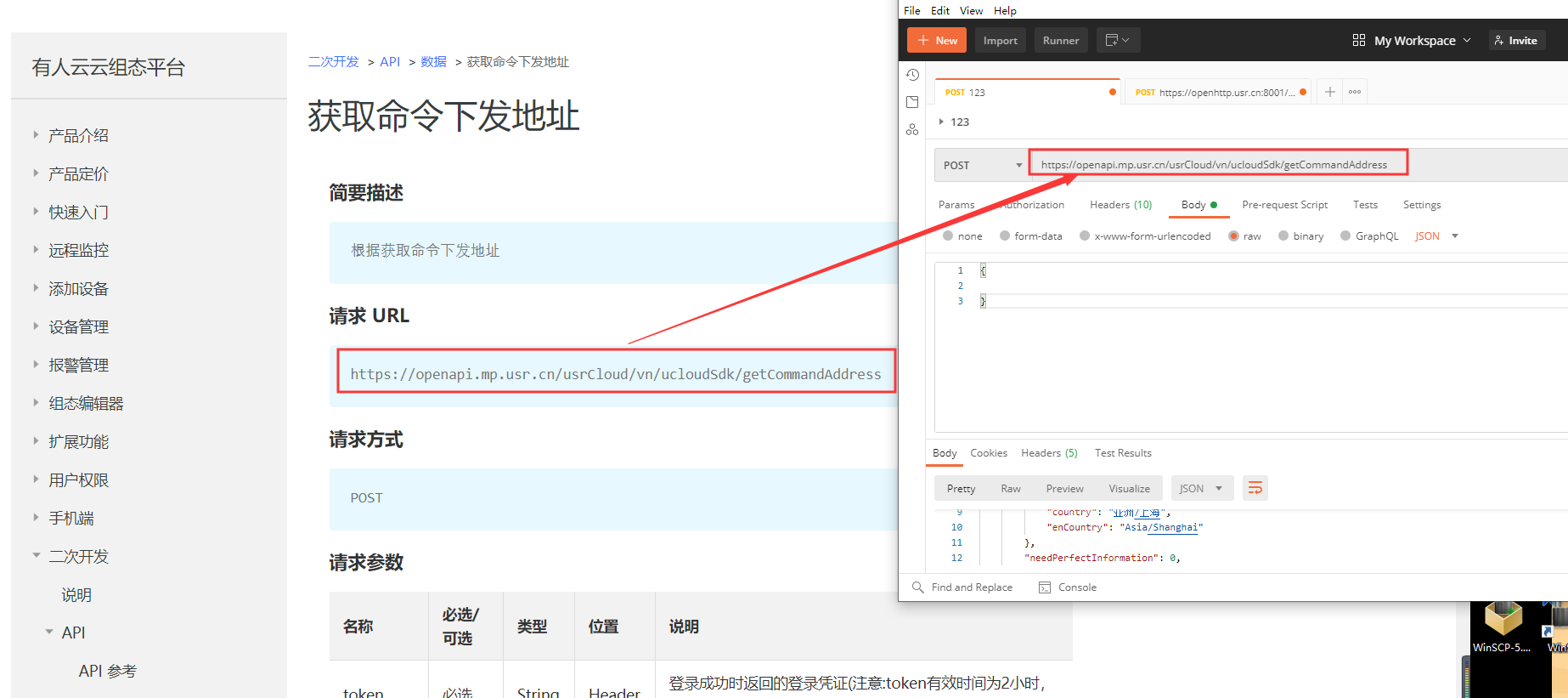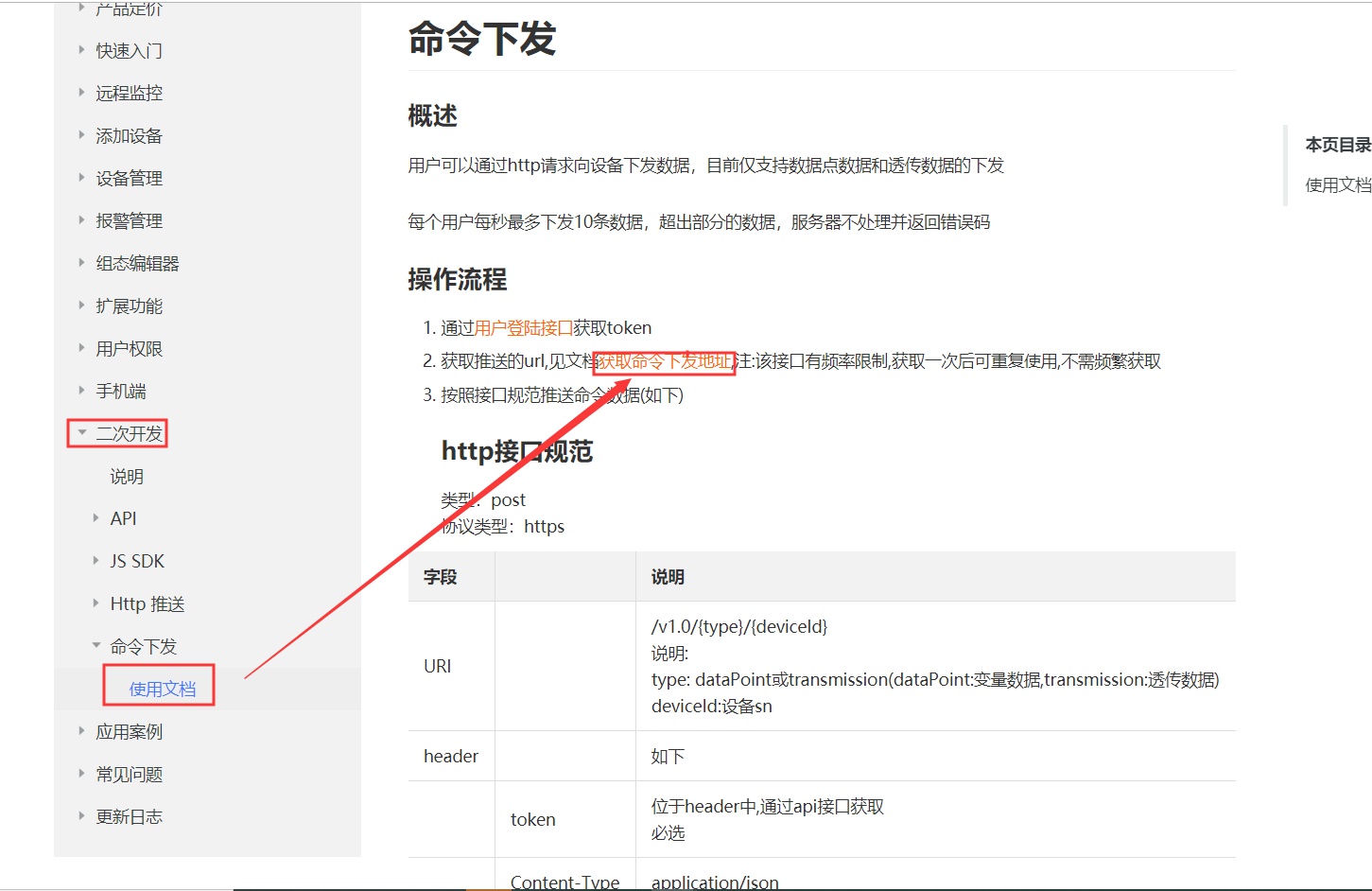 4、在二次开发文档界面打开获取命令下发地址(二次开发-命令下发-使用文档-获取命令下发地址)