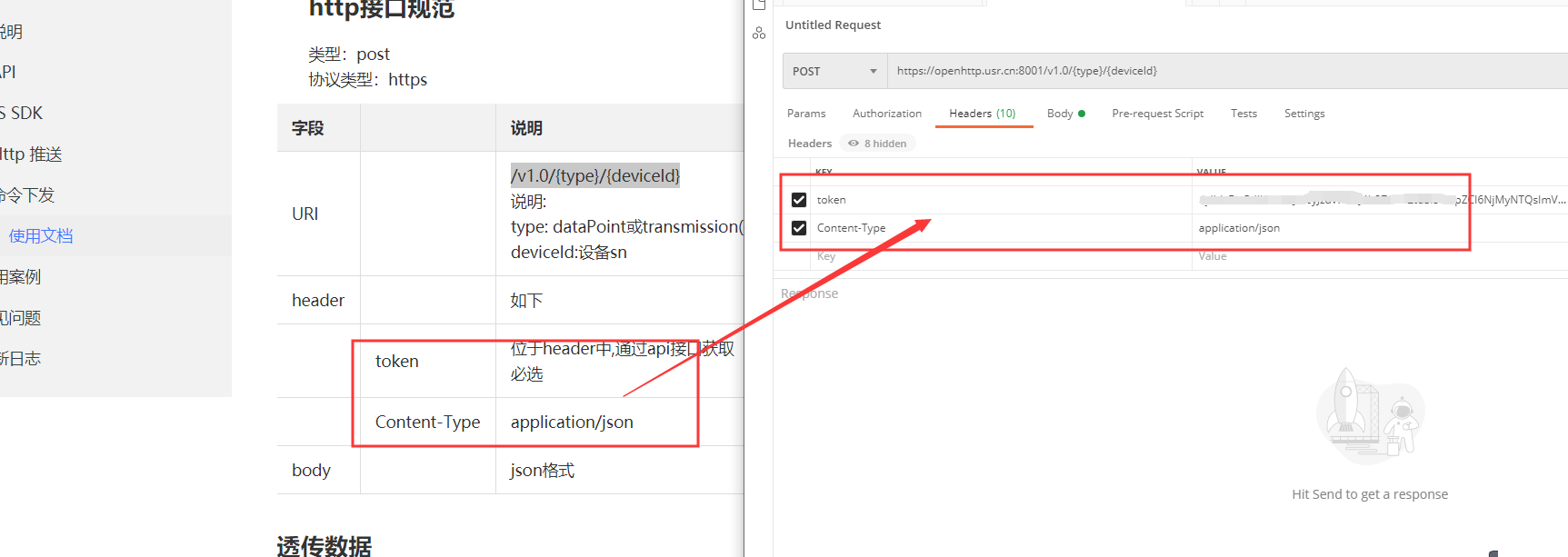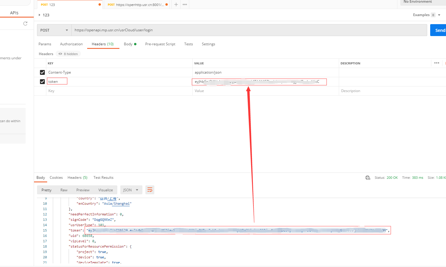 在headers中添加Content-Type和token,值分别为application/json以及刚刚获取到的token