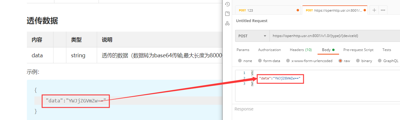 数据透传的话填入"data":"YWJjZGVmZw==",其中data中的数据为透传的数据(数据转为base64传输,最大长度为8000个字符)