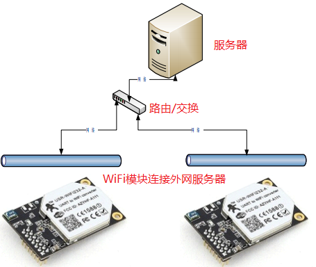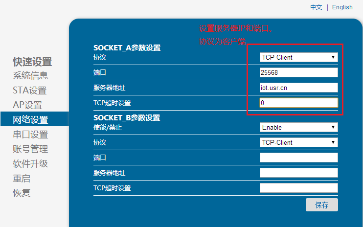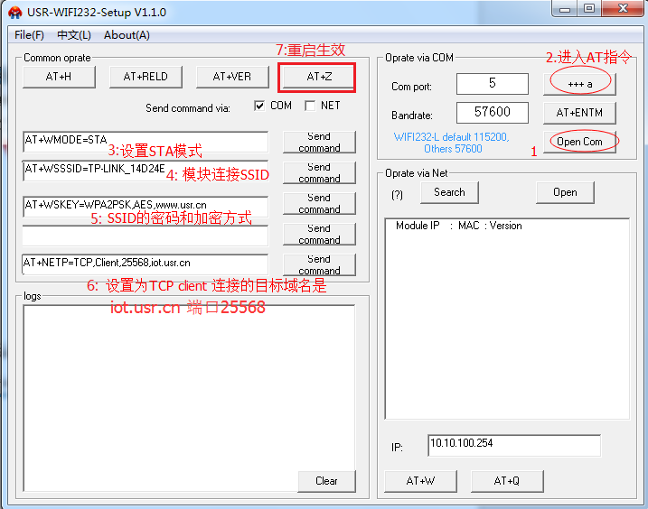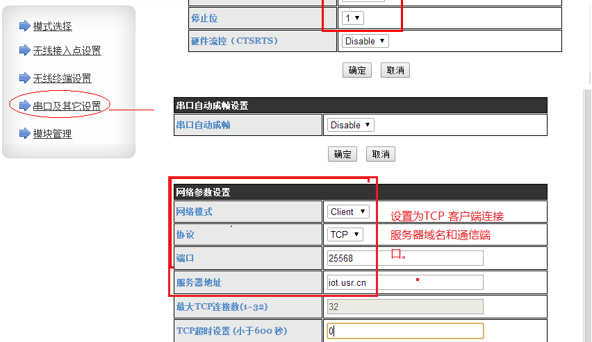 设置模块加入路由器,并且设置目标域名和通信端口(模块串口连接电脑的串口,然后设置参数。)设置软件下载链接:http://www.usr.cn/Download/91.html