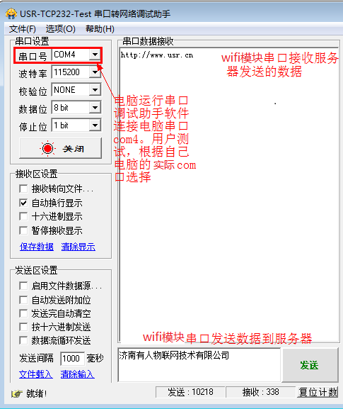 以上是服务器发送数据和接收数据:以下使用电脑串口连接WiFi串口串口,电脑运行串口调试软件,进行发送和接收服务器的数据。