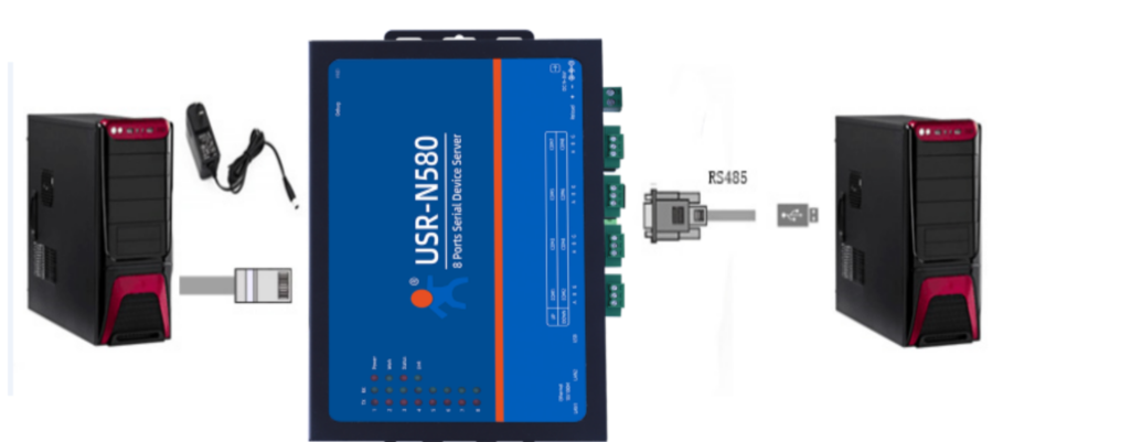 USR-N580-H7产品,USB-RS485串口线接N580串口一,注意485接线线序,USB-RS485 A线接N580 串口一的A端子,USB-RS485 B线接N580 串口一的B端子,USB头插入电脑USB口。