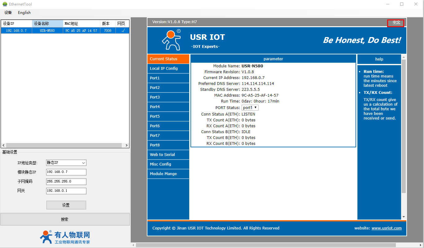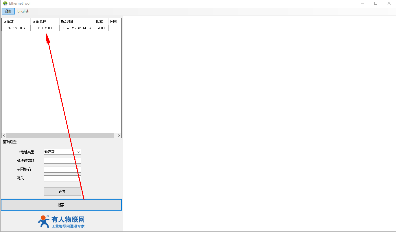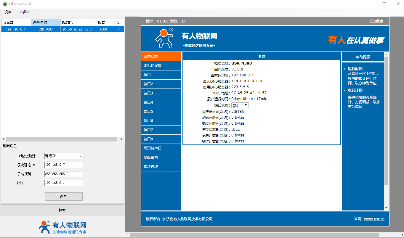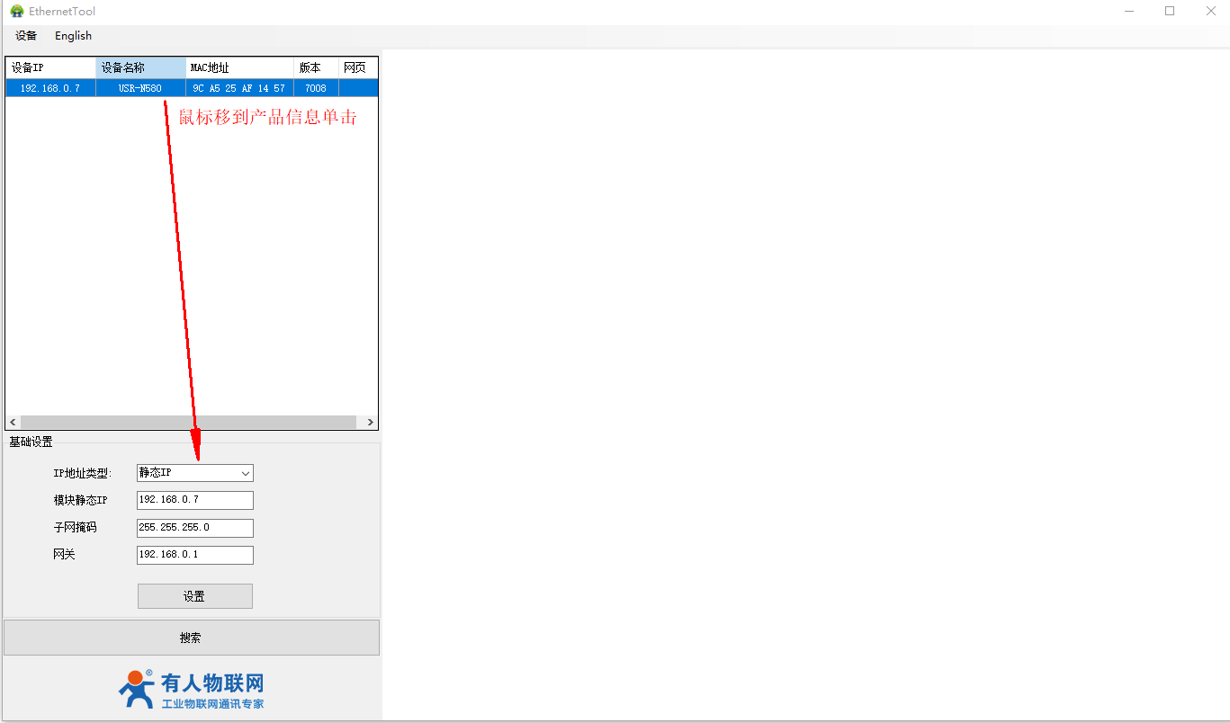 显示IP 192.168.0.7之后,鼠标单击产品信息,基础设置显示IP类型、IP、子网掩码、网关信息。