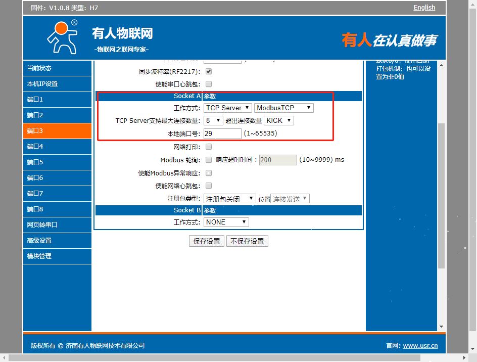 N580 RS485串口做TCP server,选择MODBUS TCP选项,本地端口保持端口23。