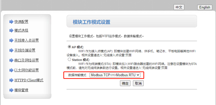 4>工作模式设置:选择modbus TCP<=>modbus rtu,等所有参数设置完成后一起重启