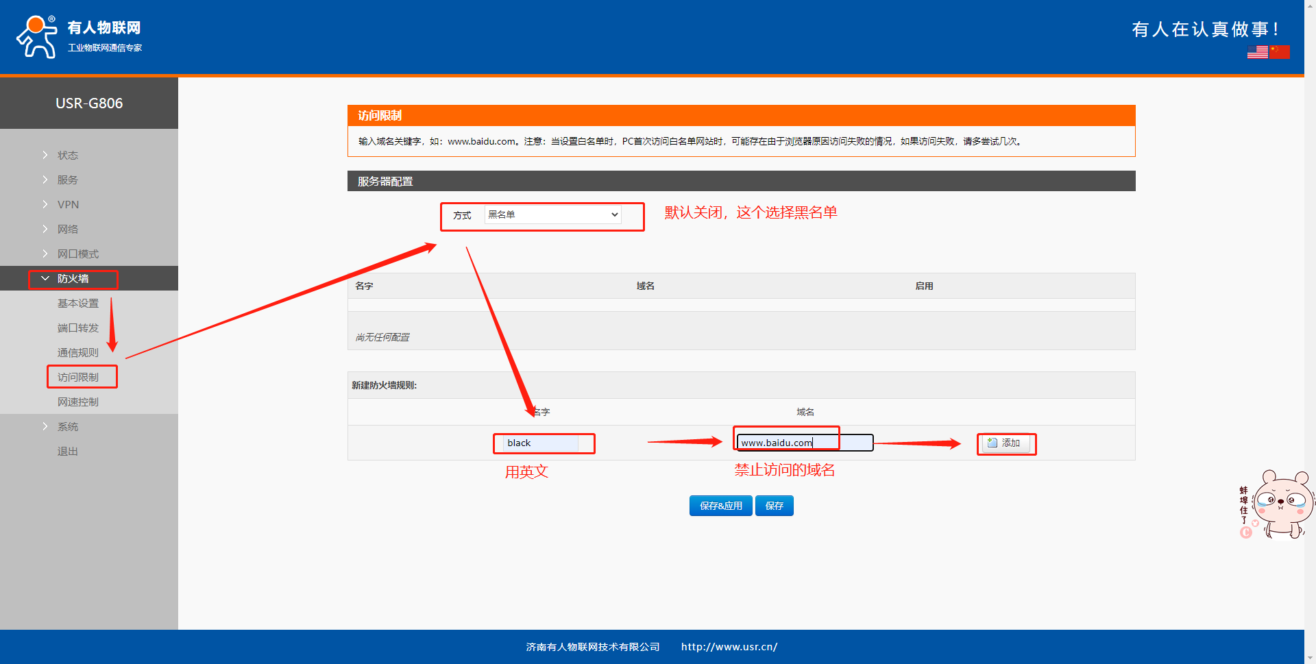 功能解释:连接路由器的设备无法访问黑名单的域名,其它域名地址可以正常访问