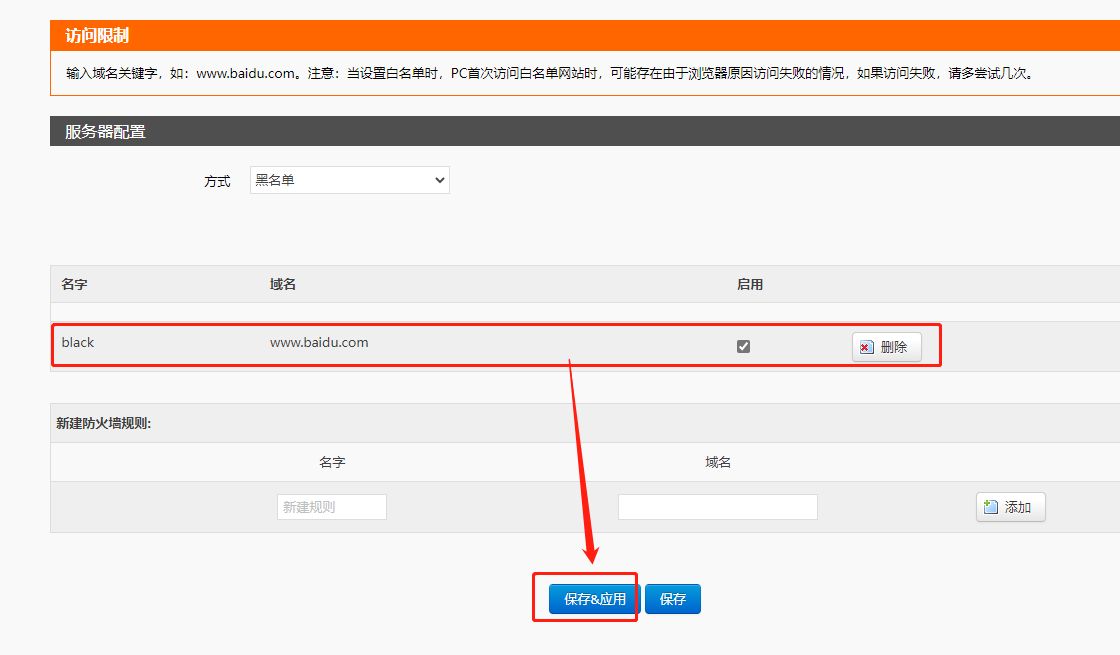 2>设置域名黑名单,注意:最后一定要“保存&应用”,参数才会生效