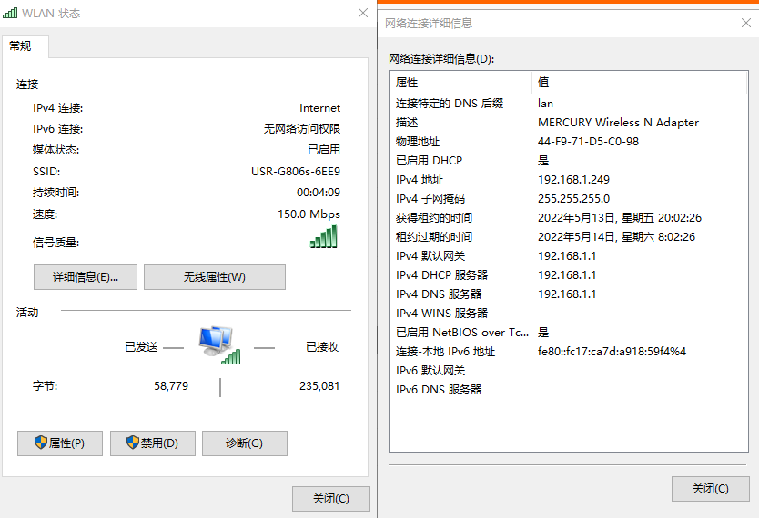 电脑自动获取的IP为192.168.1.249,网关地址为:192.168.1.1即G806s的LAN口IP