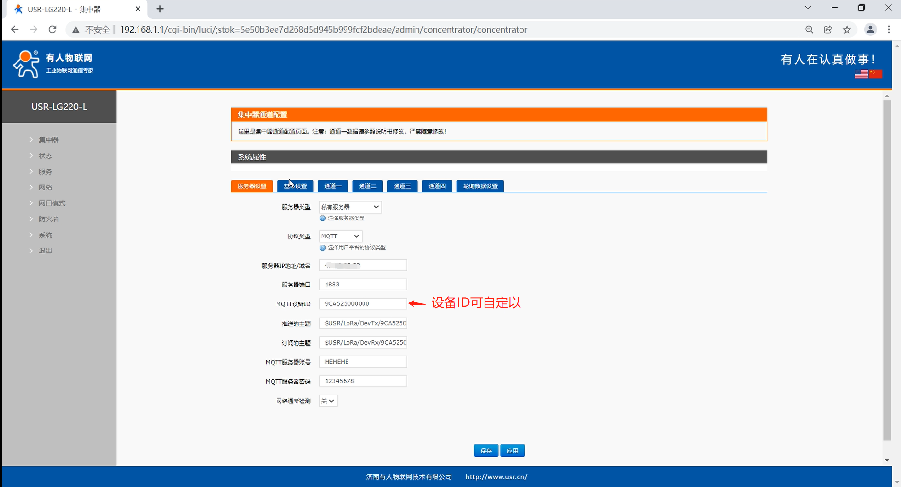 服务器配置项包括:服务器 IP地址/域名、服务器端口、MQTT设备ID、推送/订阅的主题、MQTT服务器账号和密码,具体设置位置请参看下图: