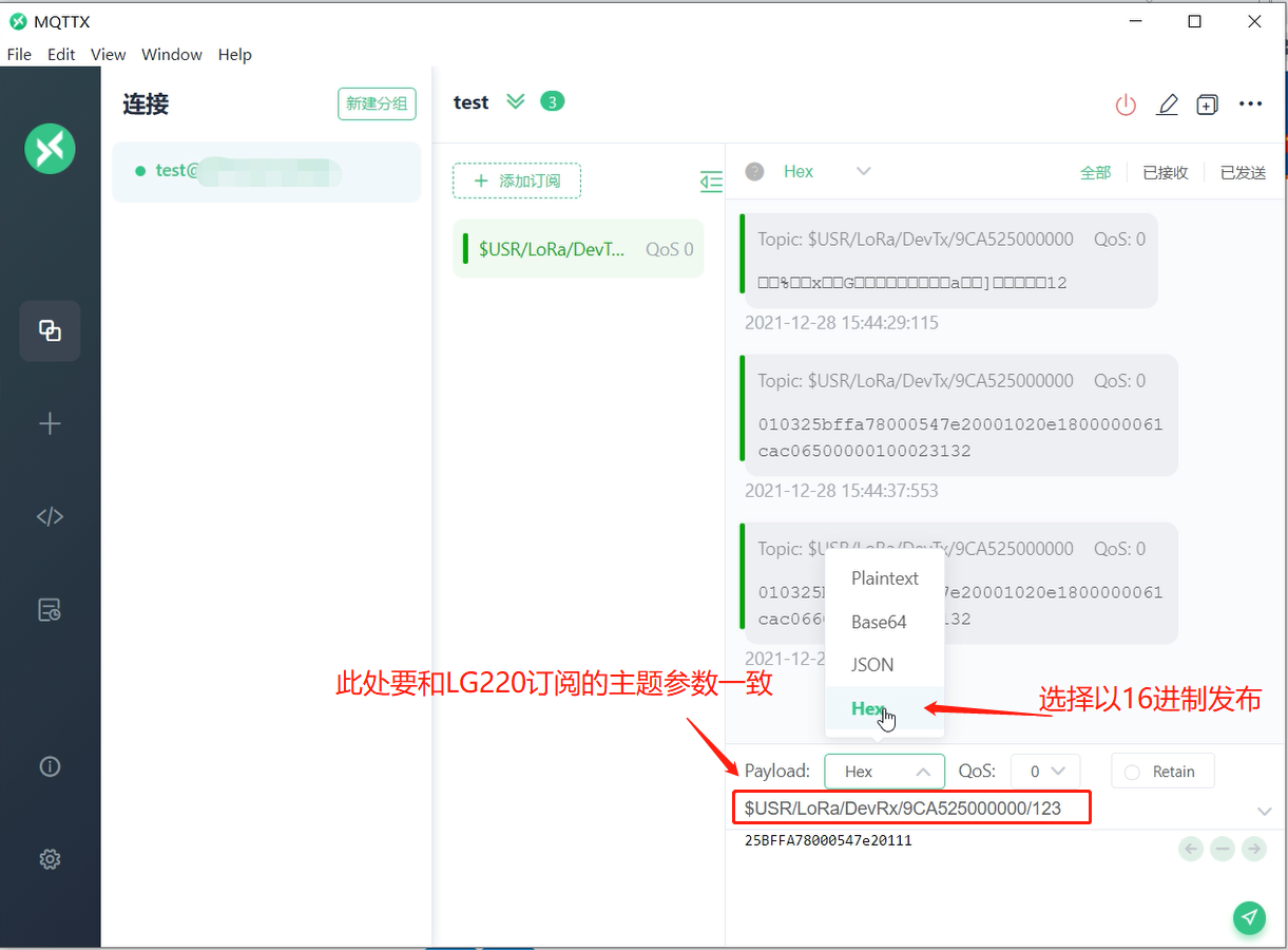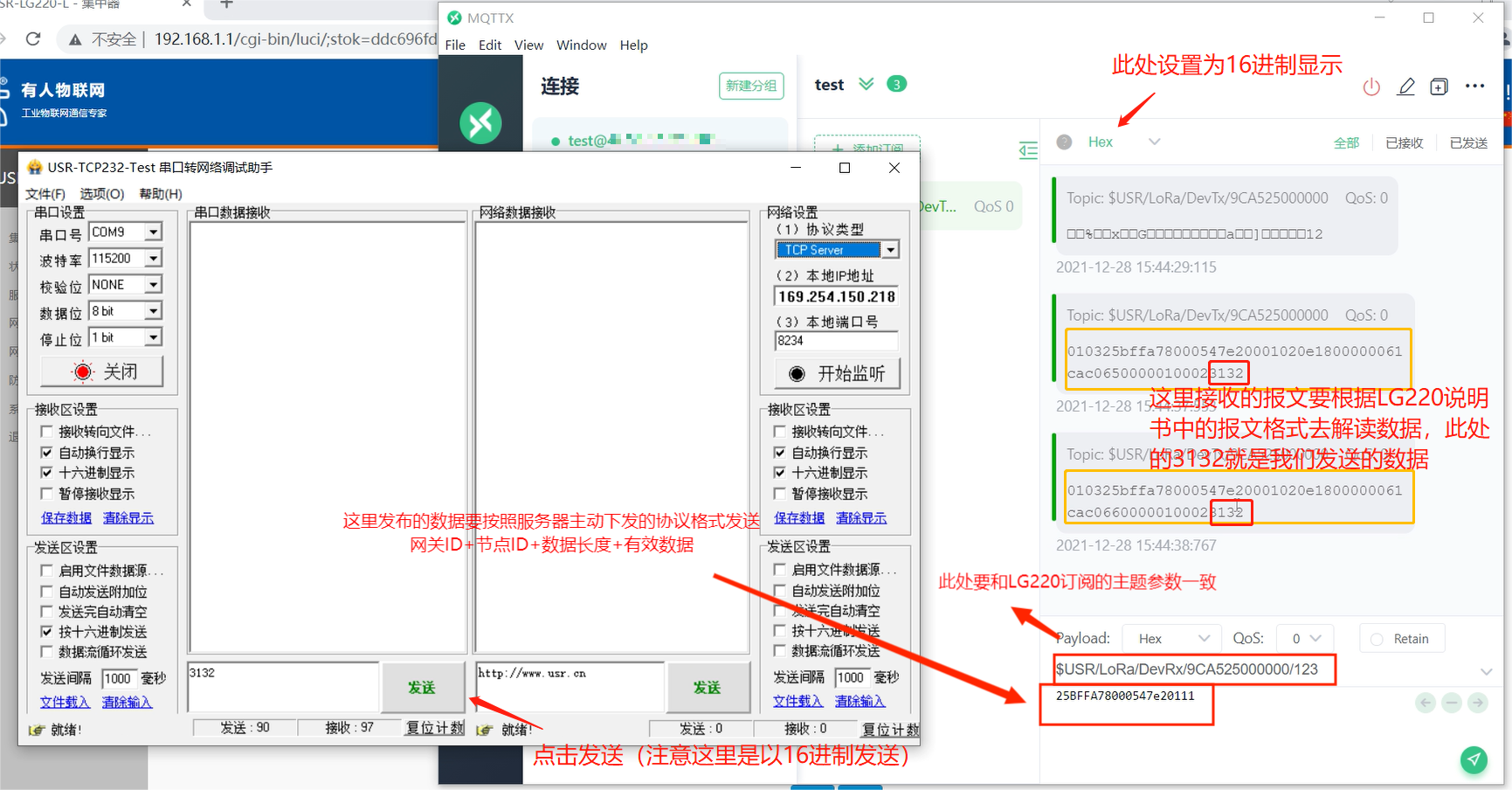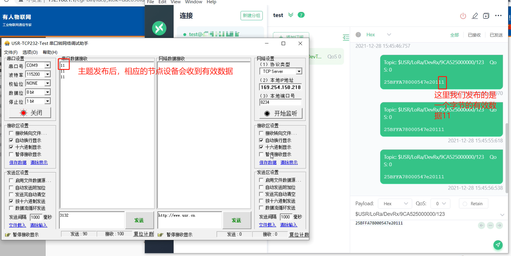 Lora节点串口连接电脑,打开串口,数据下发要遵循集中器与服务器传输协议(服务器主动下发)