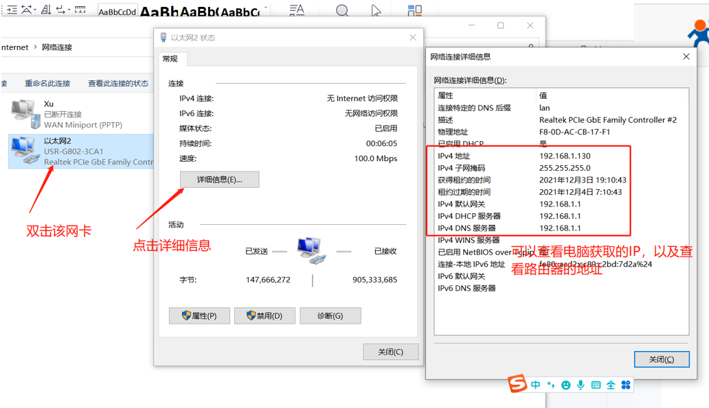 2) 双击该网卡,可以显示详细信息,查看电脑获取的IP以及路由器的地址