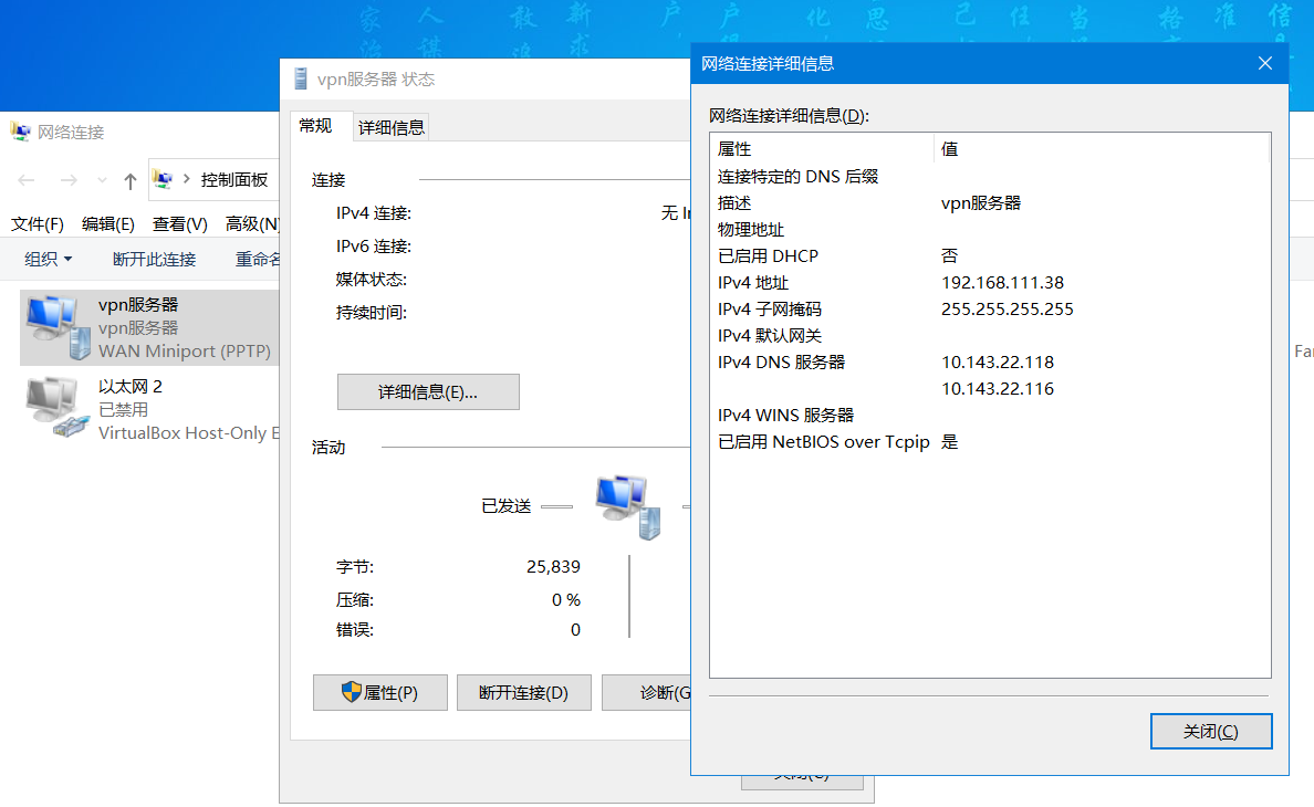 然后我们可以从网络适配器哪里查看VPN服务器给电脑分配的信息