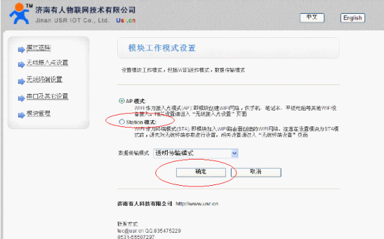 2.在页面首页将模块的工作方式改为STA模式,点击确定。(此时网页会提示重启模块,先不要重启,全部设置完成后再重启模块)