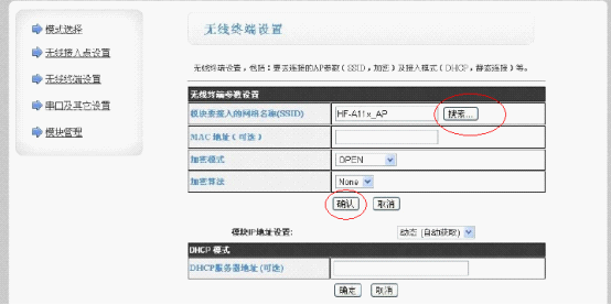 3.登录无线终端设置界面,点击搜索按钮,选择要加入的无线AP,再填入准确的密码,点击确认。如果需要给模块设置固定IP,请在下面的“模块IP地址设置”选项中设置,设置完成后同样需要点击确定。