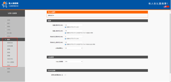 2、默认开启有人云服务功能。界面可以配置流量统计、网络监测、参数配置、固件升级、等有人云特殊功能