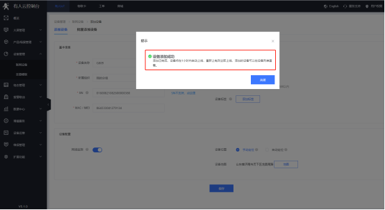 5、设备添加完成,设备将在1小时内自动上线,重新上电则立即上线,添加的设备可以在设备列表查看,至此在有人云上添加设备完成