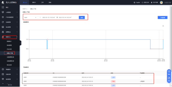 (4)在“数据中心”--“设备上下线”界面中可以查看相应设备的上下线记录,同时数据支持下载成EXCEL表格保存至本地