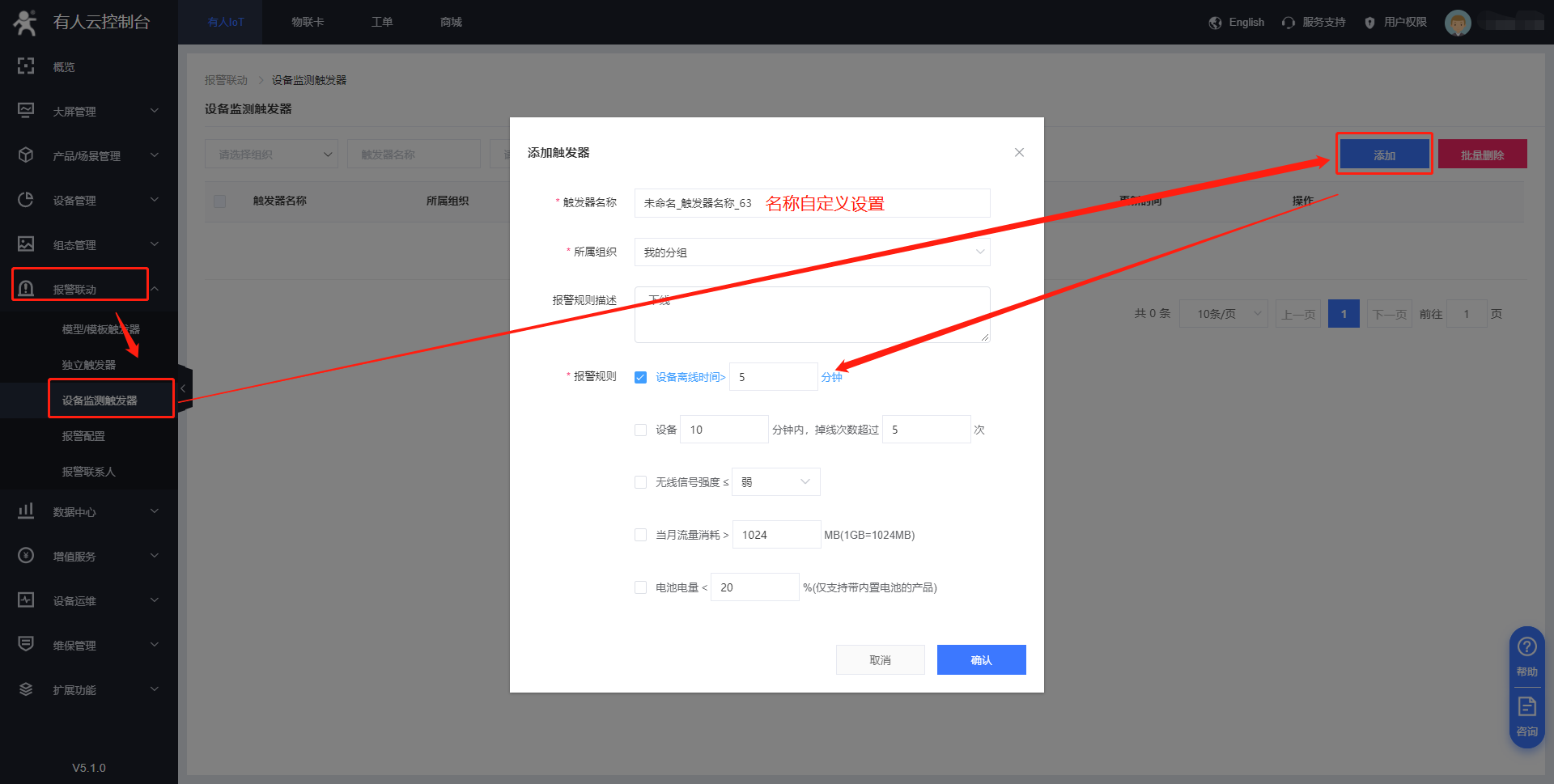 (3)在“报警联动”--“设备监测触发器”界面中可以对G809设备进行相应的报警设置,比如频繁下线告警、信号强度过弱报警,到达设定值可以看到报警提示。