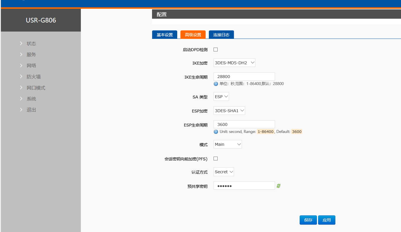 (5)会话密钥向前加密(PFS):提供不启用、DH1、DH2、DH5 共 4 个选项。本项设置需保证本段和对端一致