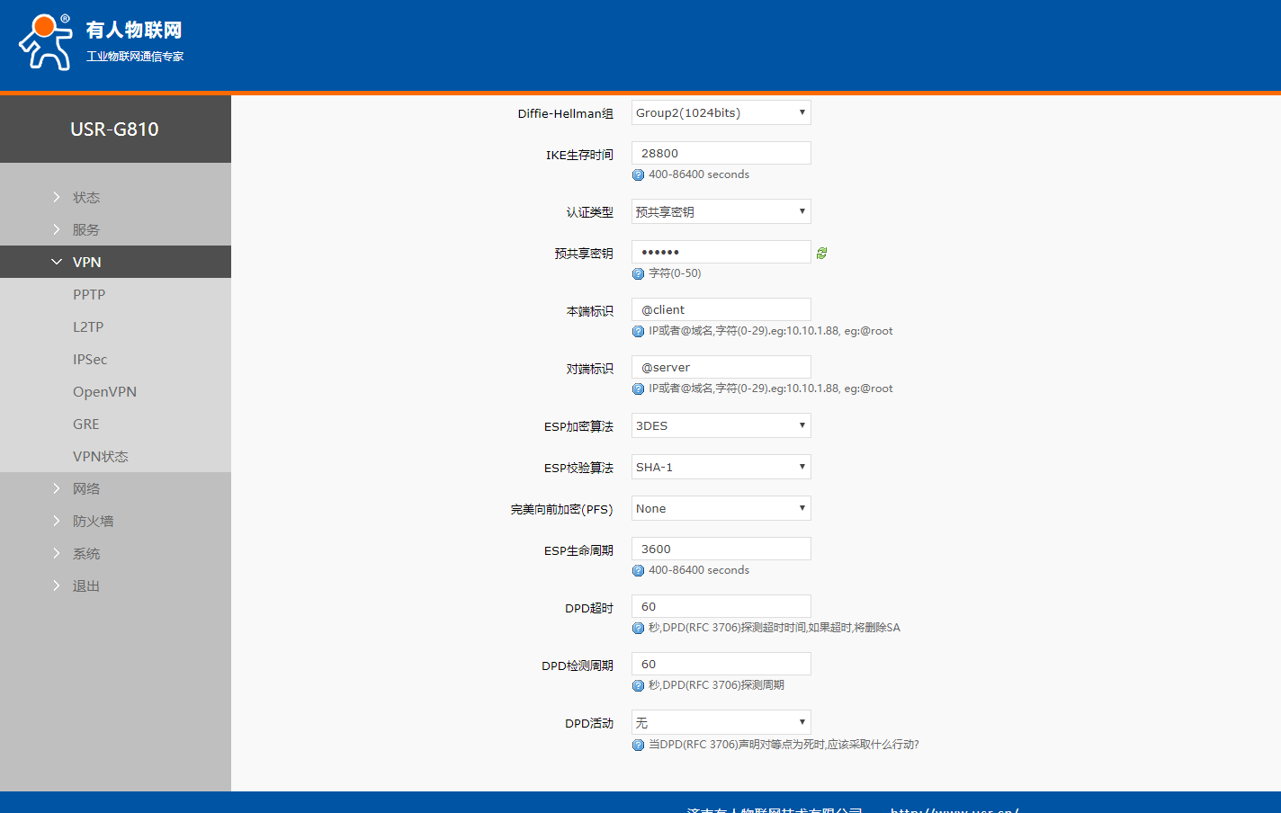 IKE 生命周期:设置 IKE 的生命周期,单位为秒,默认:28800