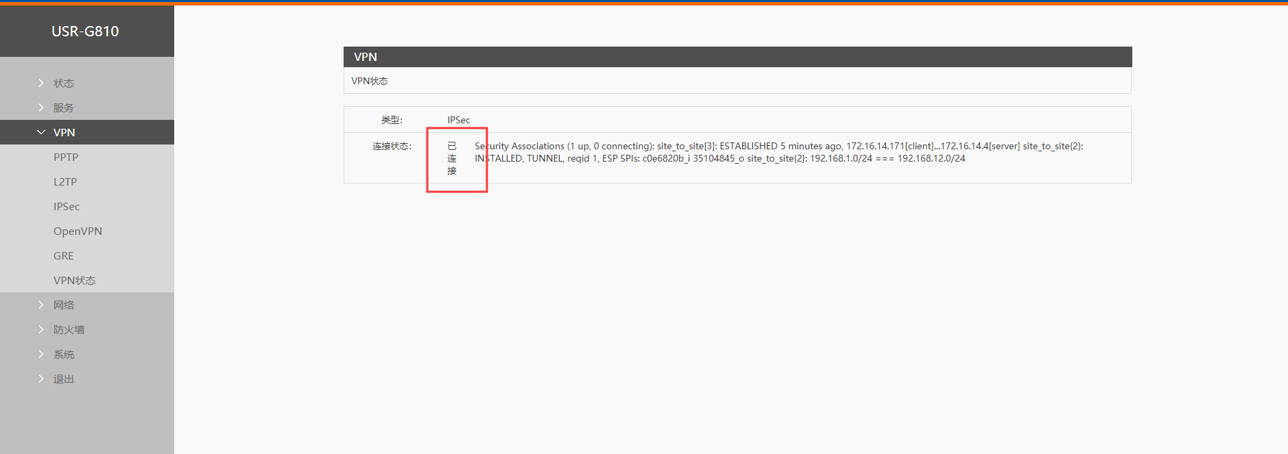 3、测试结果:在 VPN 状态处可查看到“IPSec 已连接”提示,说明IPSEC已成功连接