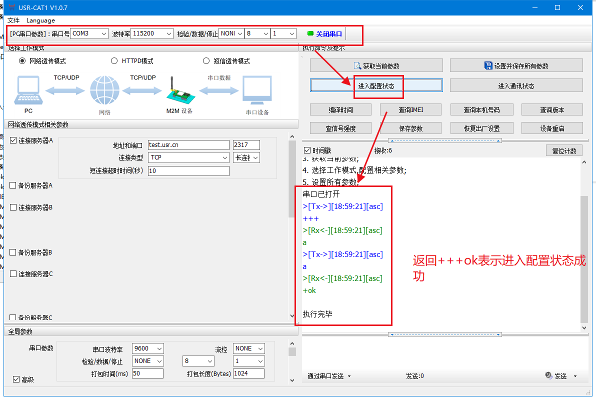 注:点击进入配置状态,如果模块能返回+ok的字符,说明电脑和模块连接是没有问题的