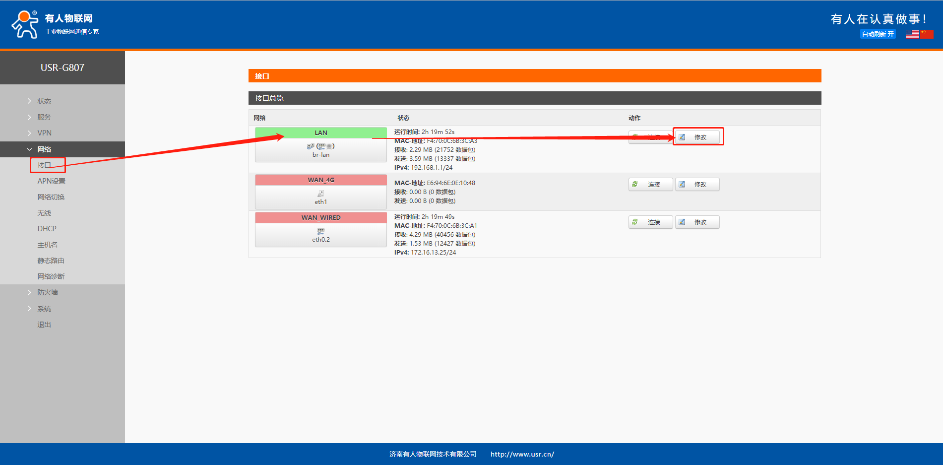 3、进入网络--接口界面,点击LAN口对应的修改按钮,进入修改界面