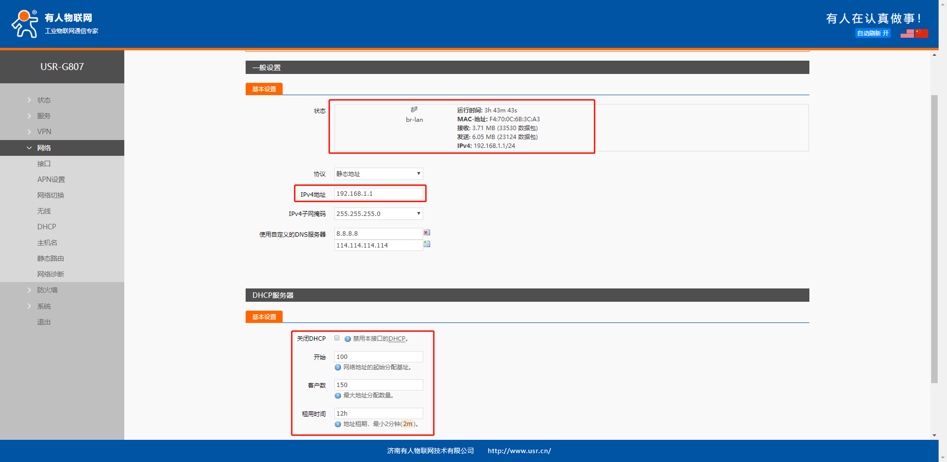 4、路由器G807默认出厂LAN IP为192.168.1.1,以及默认开启DHCP功能等,可以在此界面修改LAN参数