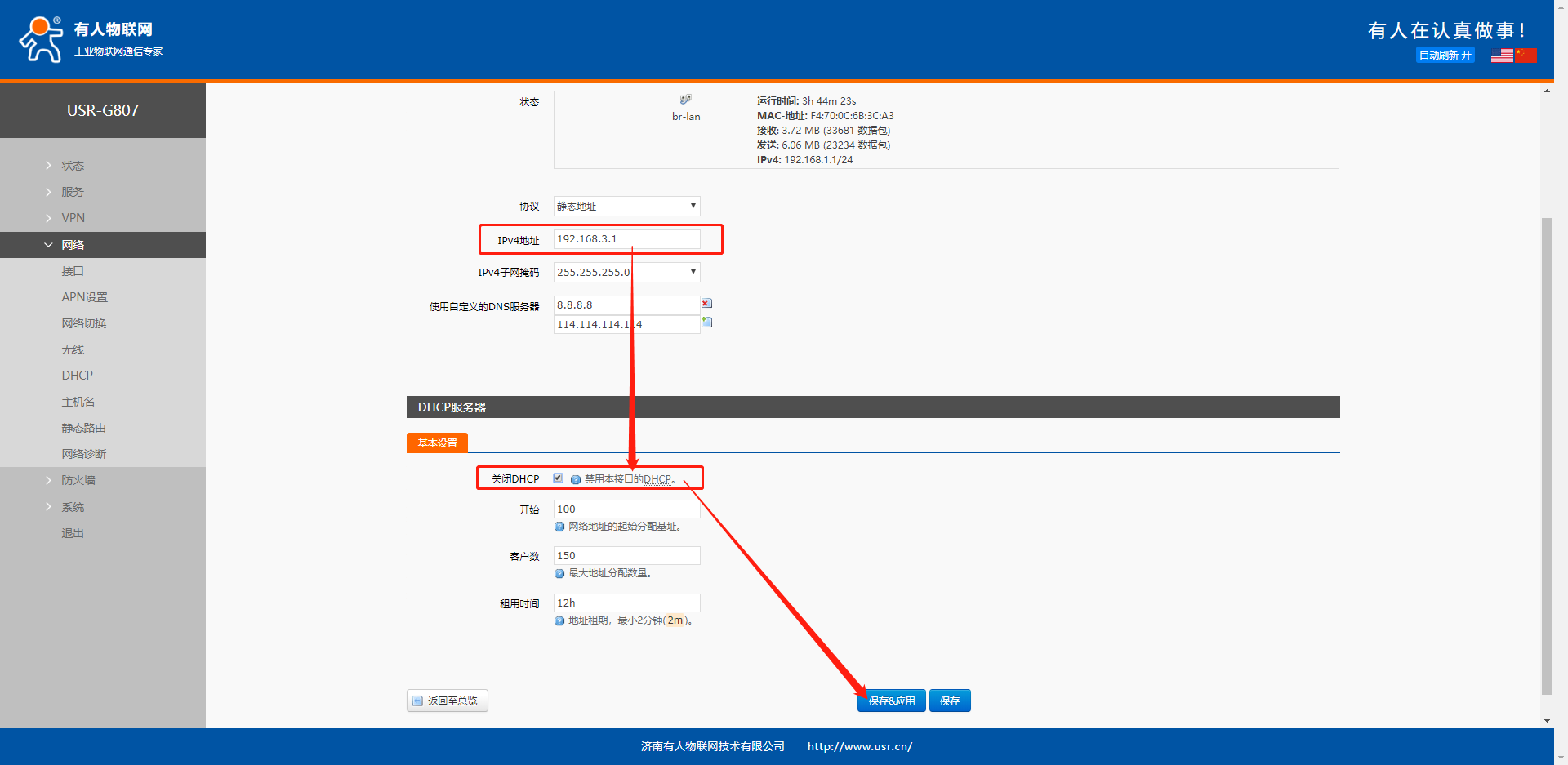 5、这里我们测试修改一下LAN网段,将LAN口改成3网段,网关地址192.168.3.1。以及关闭LAN口的DHCP功能。DHCP功能为动态分配IP功能,若关闭则路由器无法给下级自动分配IP,下级设备需以相同网段和网关的IP静态接入才能获取网络.修改完成后点击下方保存并应用按钮
