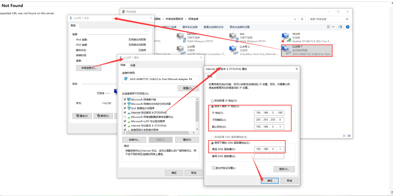 6、参数应用完毕后,重新连接有线、wifi,或重启G807。打开对应方式的网络适配器,将IP地址修改以静态方式接入,IP和网关要与之前设置的LANIP网段一致,这里把电脑IP设置为192.168.3.100,网关与DNS保持一致192.168.3.1.保存此网卡