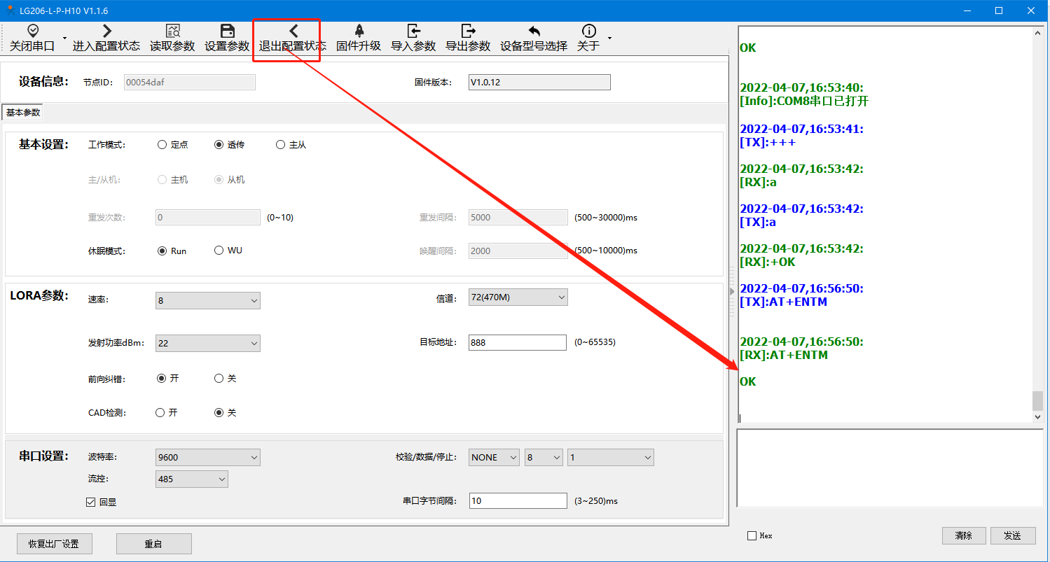 5. 进入配置状态:打开串口---进入配置状态,收到+ok说明进入配置状态成功,否则失败。进入配置状态失败,则无法正常进行参数配置了。