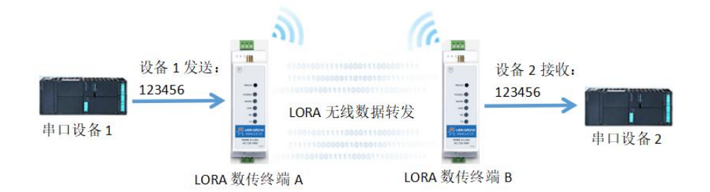 使用RS485串口线分别将LoRa数传终端A、B接入串口设备(以PC机代替),给LoRa数传终端装上天线,然后给LoRa数传终端上电。