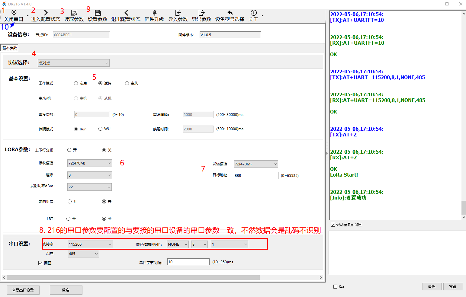 点击打开串口(选择A、B对应的串口号,DR216默认串口参数:115200,None,8,1,NFC)、进入配置状态、读取参数、配置速率等级8,信道72,目标地址888, 串口设置中的参数配置为您实际要连接的串口设备的串口参数, 点击设置所有参数,关闭串口。