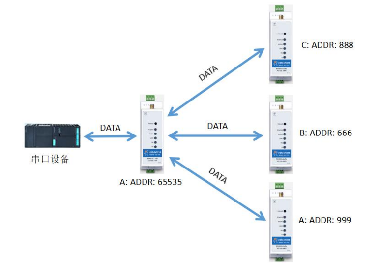 所有设备工作在透传状态,保证广播发送的模块的ADDR为65535,其他设备与广播设备的速率等级、信道参数相同。