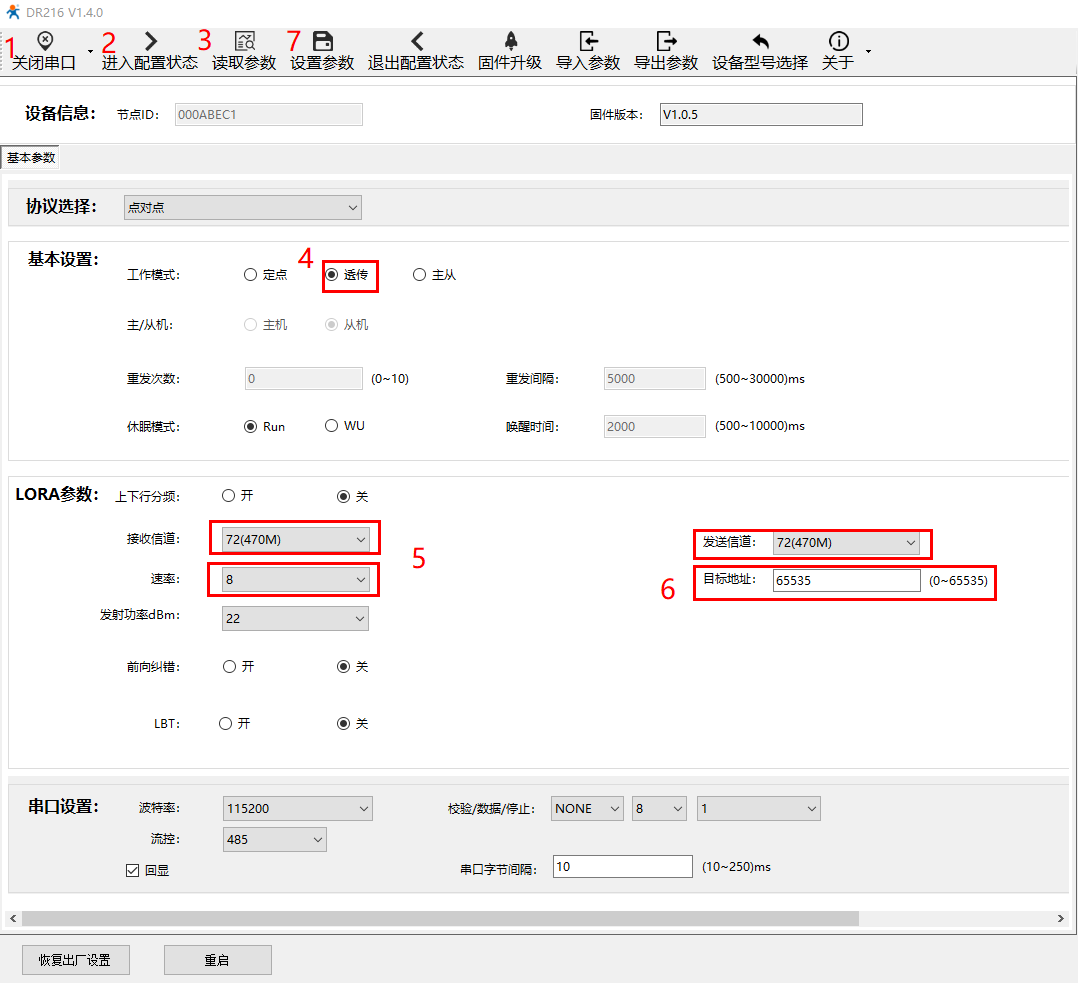 根据上面步骤配置设备B:透传模式,速率8,信道72,目标地址888。