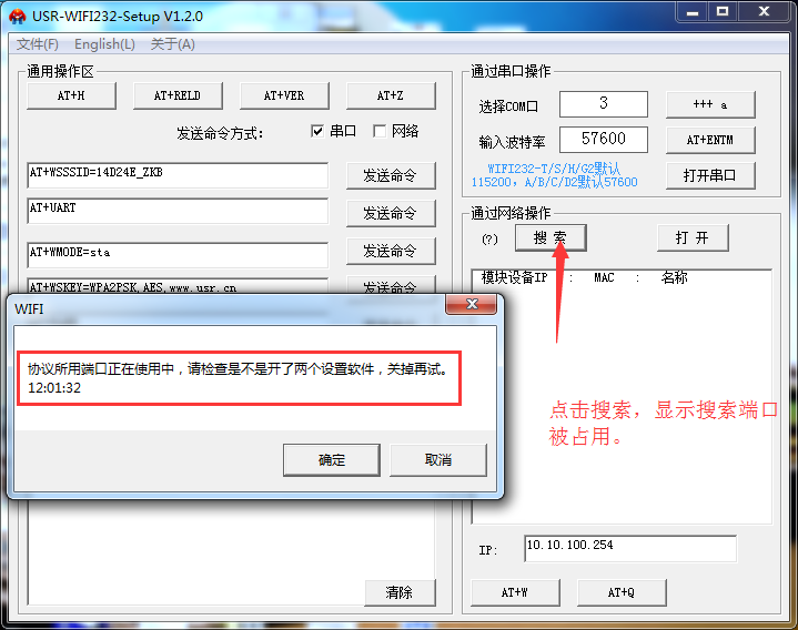 1:WiFi232-Setup软件,点击搜索时,显示端口被占用。