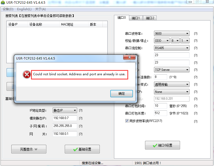 2:TCP232-E45设置软件搜索之后的显示,端口被占用。