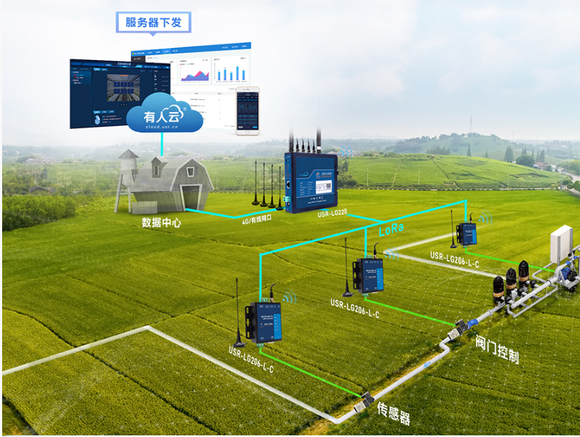 LG220选择服务器下发功能,可快速实现远距离数据收发,对灌溉、病虫害、施肥情况在线监测,从而减少值守人员数量,全面提升农场生产管理水平,提高经济效益,降低运营成本