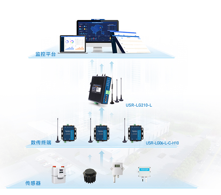 LG210-L与仓储内的温湿度传感器相连,对其下发指令,实时接收仓储内设备温湿度参数,并上传监控平台。工作人员可根据收集到的参数,对仓储情况进行判断,及时对货物进行调配,节约资源。
