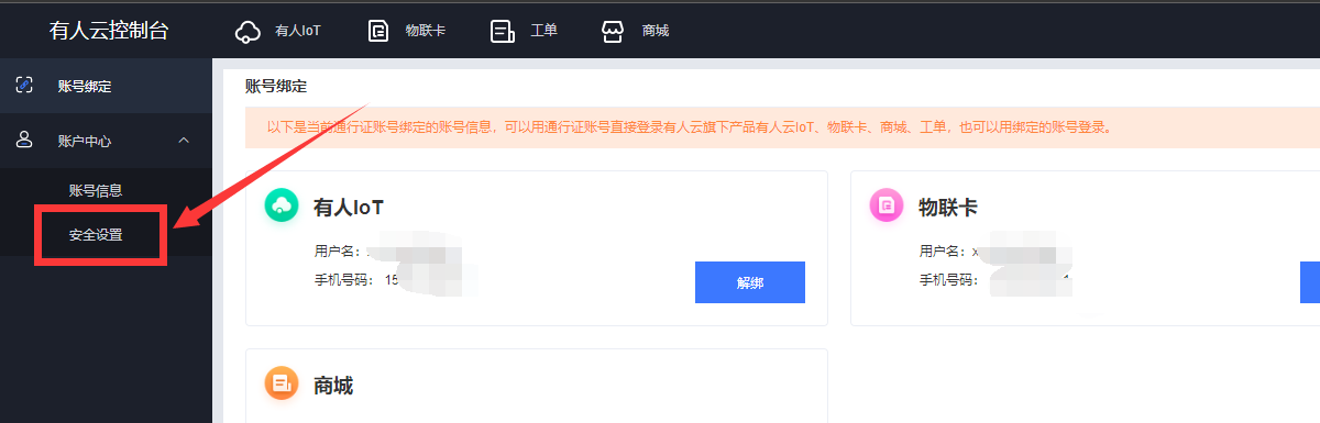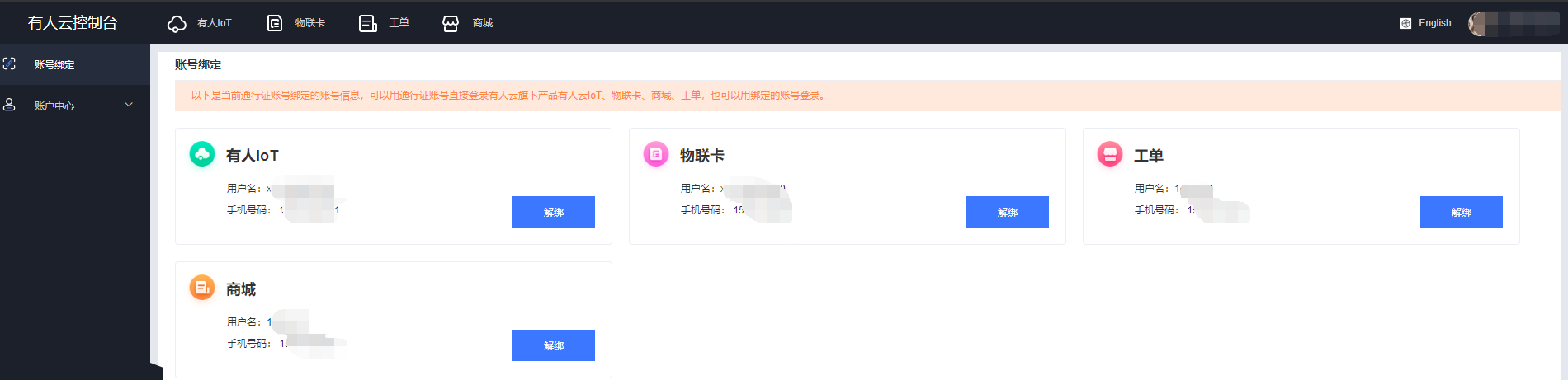 有人云账号主要分为:有人iot账号、物联卡账号、工单账号、商城账号与有人通行证账号,如果需要更换使用者,为了账号的安全,建议全部账号的绑定信息均进行修改。