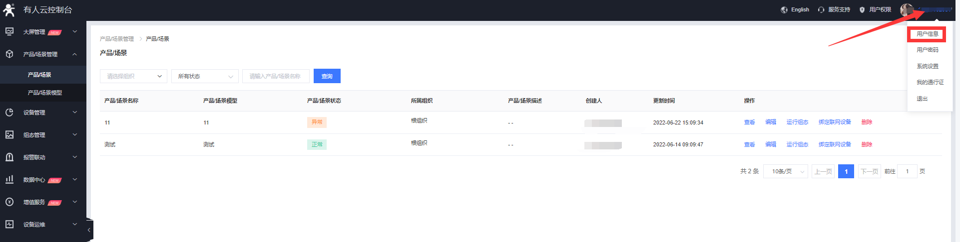 1、在有人iot界面点击右上角用户名,进入用户信息界面