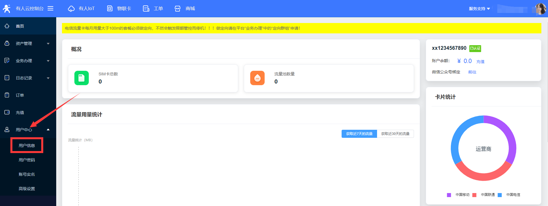 1、进入物联卡平台,在左侧 用户中心 菜单中进入用户信息界面
