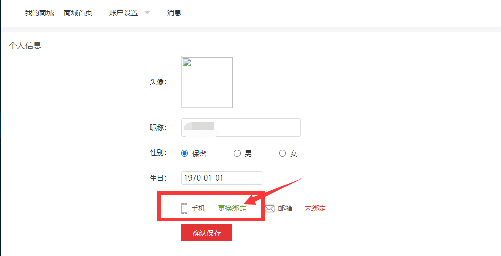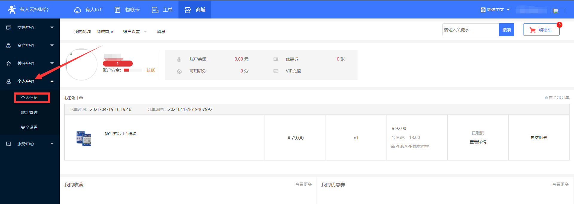 1、进入商城平台,在左侧 个人中心 菜单中进入 个人信息 界面