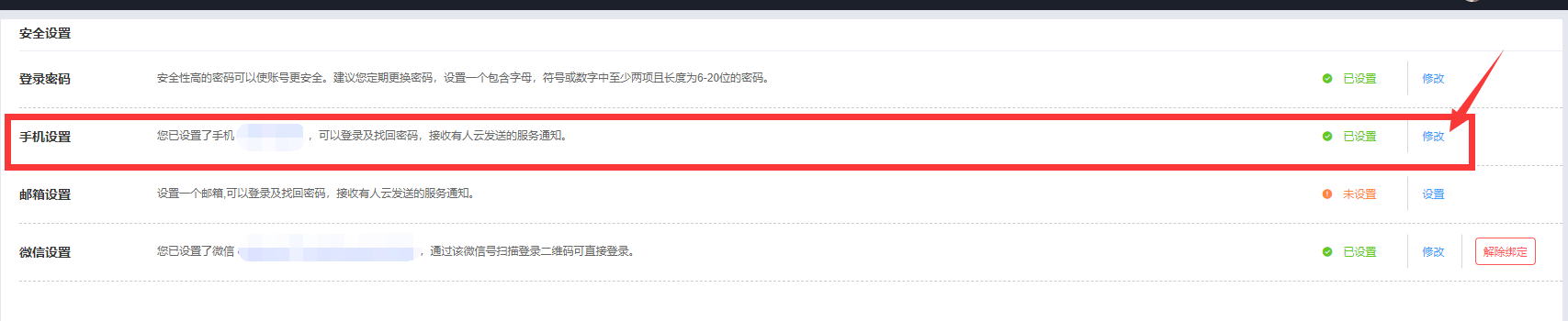 3、在安全设置界面找到 手机设置 一栏,点击后面修改