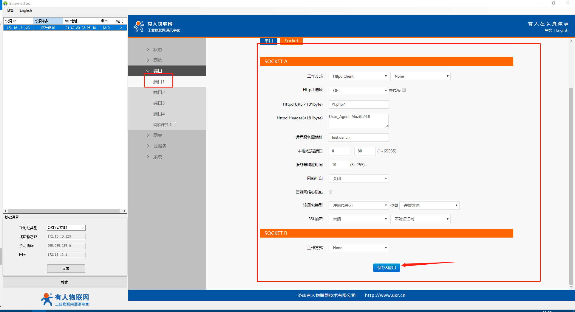 N540端口1工作方式设置HTTPD模式,GET,远程服务器地址填test.usr.cn,远程端口填80,本地端口号设置为0。URL填/1.php?,不滤除报头。