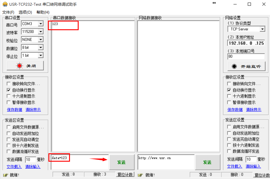10、N510用485转usb串口线接电脑,用串口调试助手打开,串口发送data=123,服务器回复123。