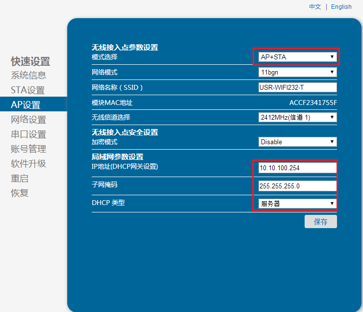 5:设置AP模式的IP地址和模式选择。