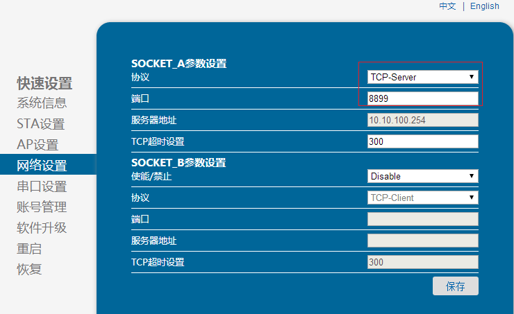 6:设置模块的网络模式为TCP-server,端口为默认8899.