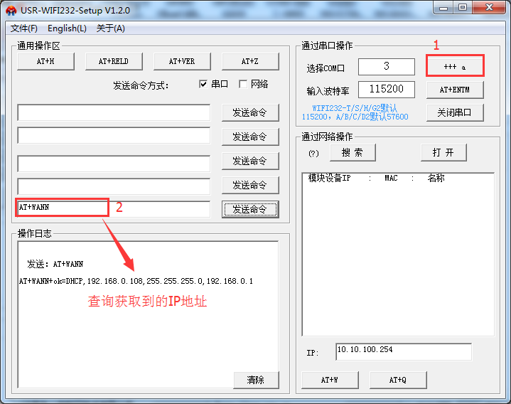 8:然后WiFi模块的串口连接电脑串口,发送AT+WANN指令查询STA模式连接到TP-LINK路由器之后分配的IP地址。使用WiFi232-setup软件
